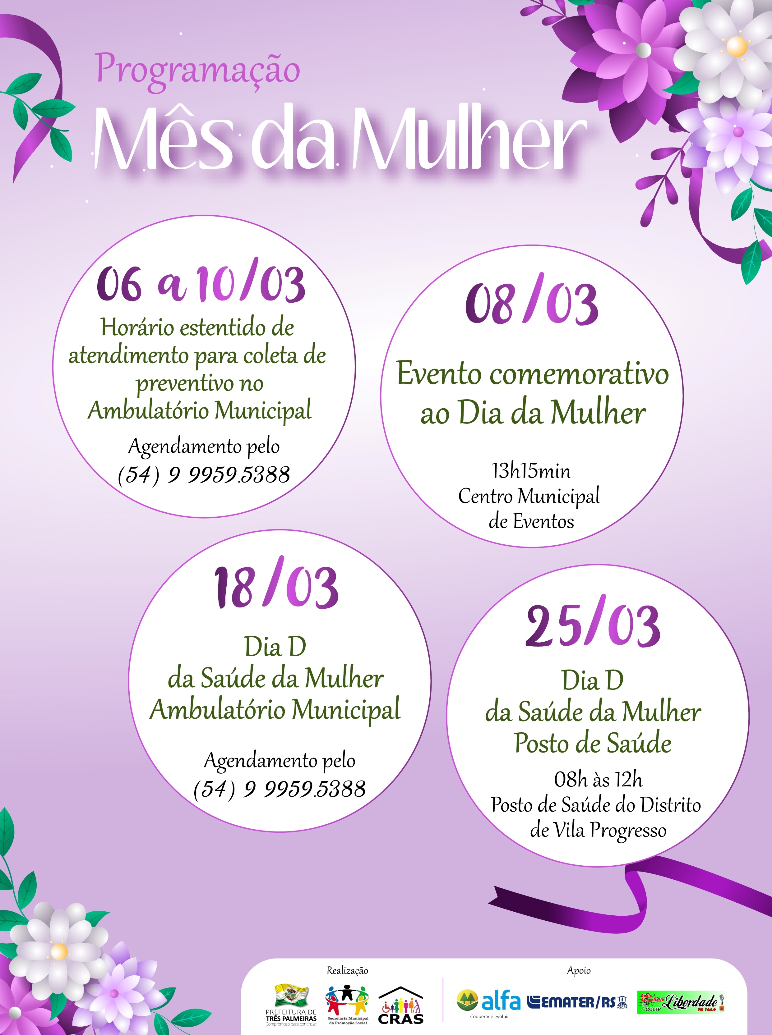 Do dia 06 a 10 de março, o Ambulatório Municipal estará com o horário estendido de atendimento para coleta de preventivo. No dia 08, evento comemorativo ao Dia Internacional da Mulher, palestra motivacional e sorteio de brindes, com início às 13h15min, no Centro Municipal de Eventos. O evento conta com o apoio da Emater/RS, Cooperalfa e Rádio Liberdade.
