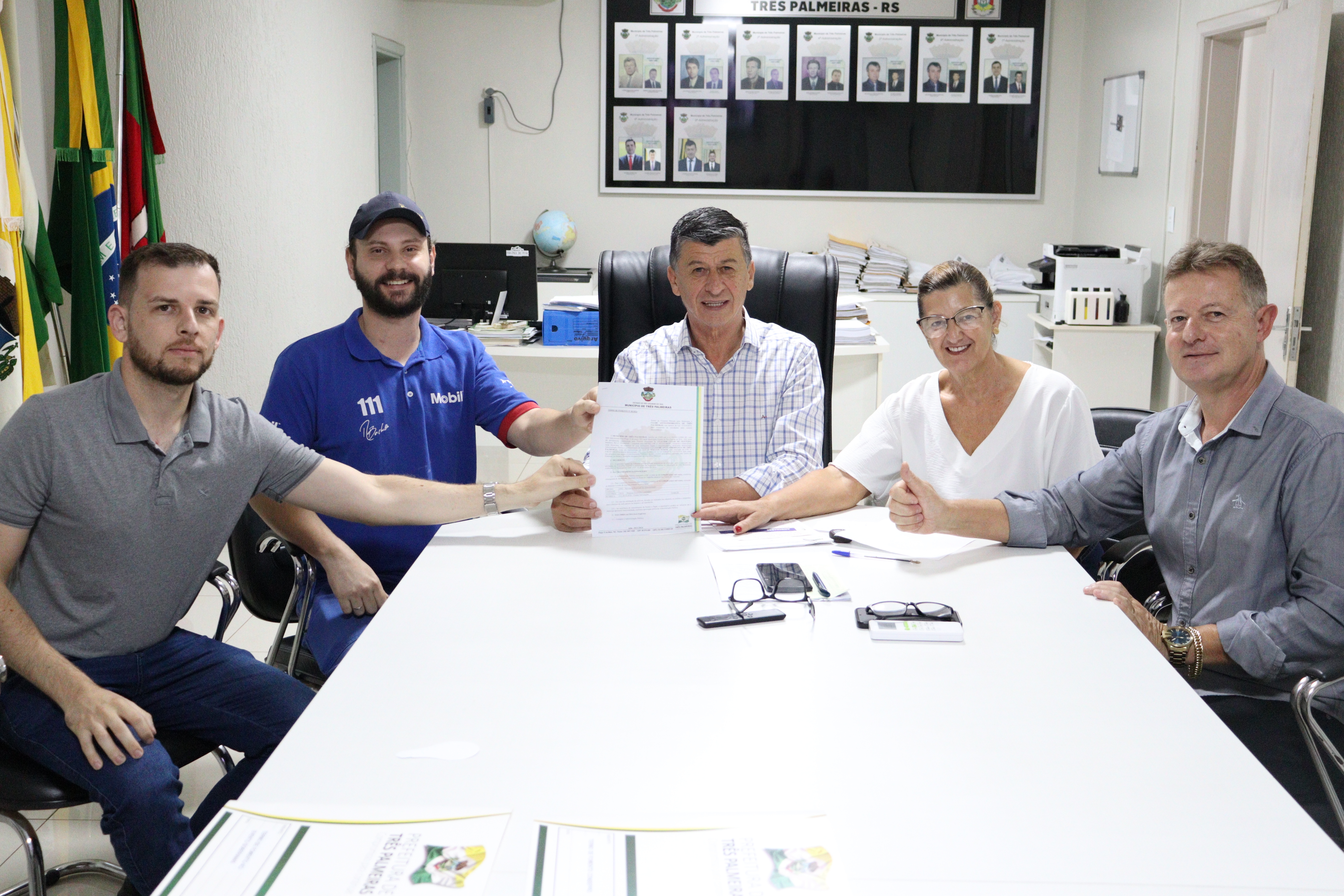 No dia 16 de abril, o prefeito Magal e o vice-prefeito Sidão, se reuniram com o presidente do Clube Antigomobilista de Três Palmeiras, Lucas Ecker, para a assinatura do termo de fomento de recursos para a entidade no valor de R$ 5 mil. O valor será utilizado no 1º Encontro de Carros Antigos de Três Palmeiras que será realizado no dia 04 e 05 de maio.