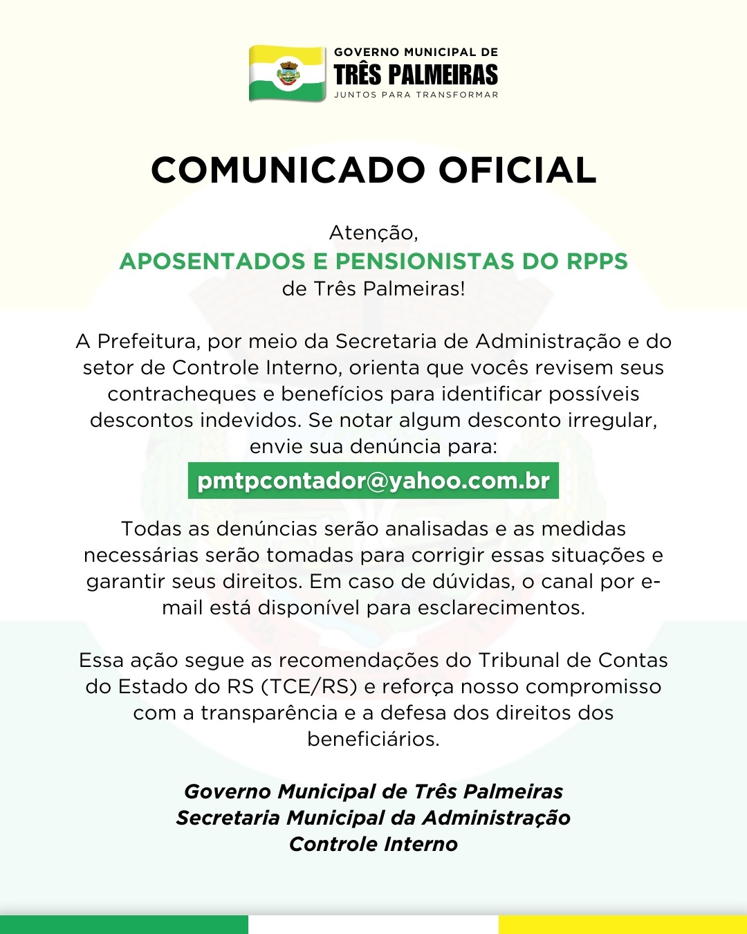 A ação segue recomendações do Tribunal de Contas do Estado do Rio Grande do Sul (TCE/RS), conforme disposto no Ofício Circular nº 24/2025. O documento reforça a importância de promover uma comunicação clara e eficaz com os segurados, além de disponibilizar canais oficiais para denúncias de irregularidades nos pagamentos.